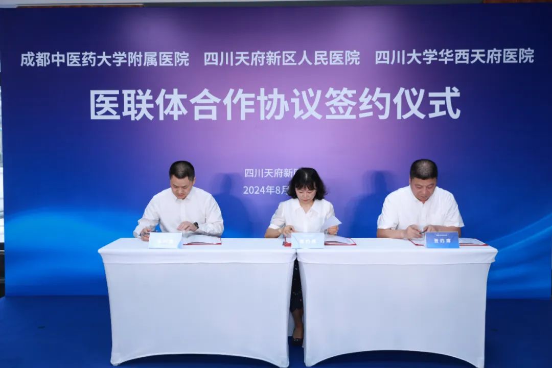 2024年8月,华西天府医院与天府新区人民医院签订《医联体合作协议》,开展专家门诊、技术帮扶等深度合作;并选派1名副院长兼任天府新区人民医院党委书记,组织甲状腺外科、普外二(胃肠结直肠外科)、健康管理中心等专家团队定期开展门诊、会诊及质控指导,实现天府新区人民医院运营管理与临床诊疗的双轨提升。合作一年来,华西医院、华西天府医院先后派出14名副主任医师及以上级别专家前往天府新区人民医院开展门诊、手术、教学查房、病例讨论,诊疗患者1800人次。