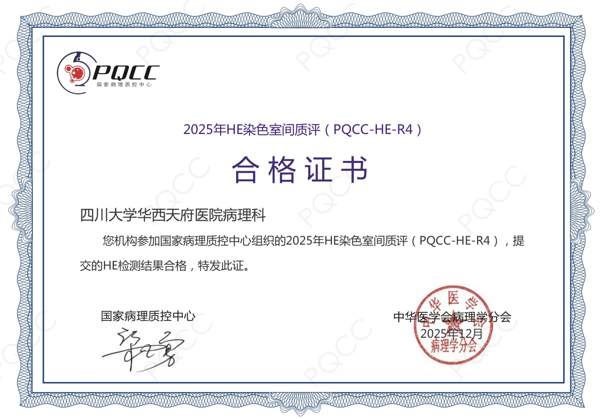 近日,我院病理科以优异成绩顺利通过国家病理质控中心(PQCC)组织的“2025年度免疫组化室间质控(PQCC-IHC-C15-HER-2-BC)”“2025年特殊染色室间质控(PQCC-SS-R11)”及“2025年HE染色室间质评(PQCC-HE-R4)”三项质控项目,并获得由中华医学会病理学分会颁发的合格证书。