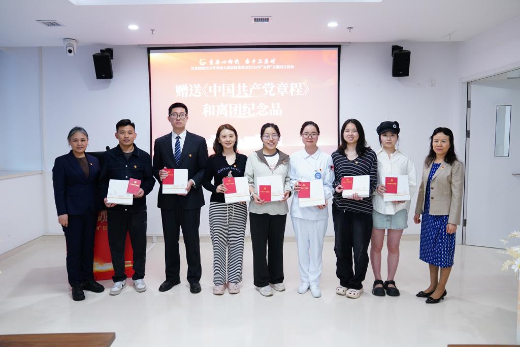 在院团委委员胡越空的带领下,超龄离团团员代表重温入团誓词。饶莉书记、刘华副书记为超龄离团团员赠送《中国共产党章程》和离团纪念品。